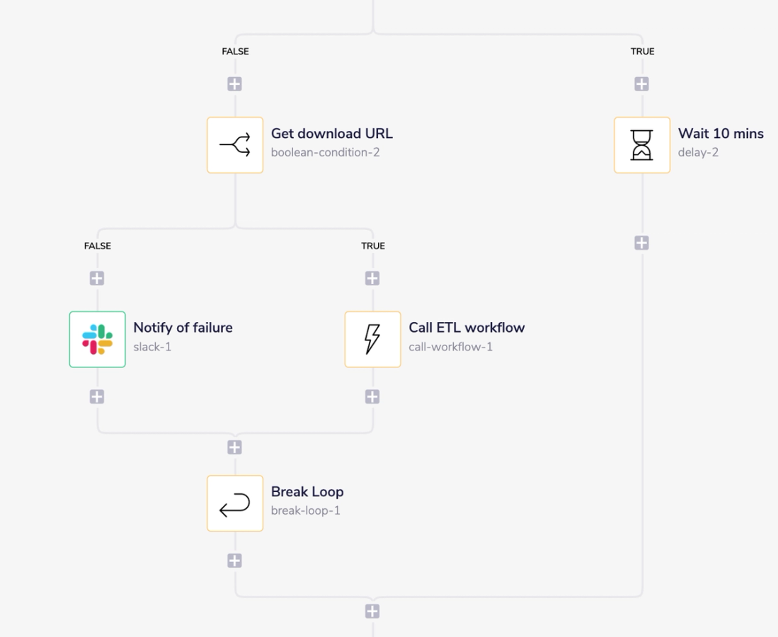 Job created? - Here, we want to confirm that we successfully created a job to prevent our workflow from running without a new batch of data. To do this, we use Boolean (true/false) logic that routes our workflow to one of two outcomes: