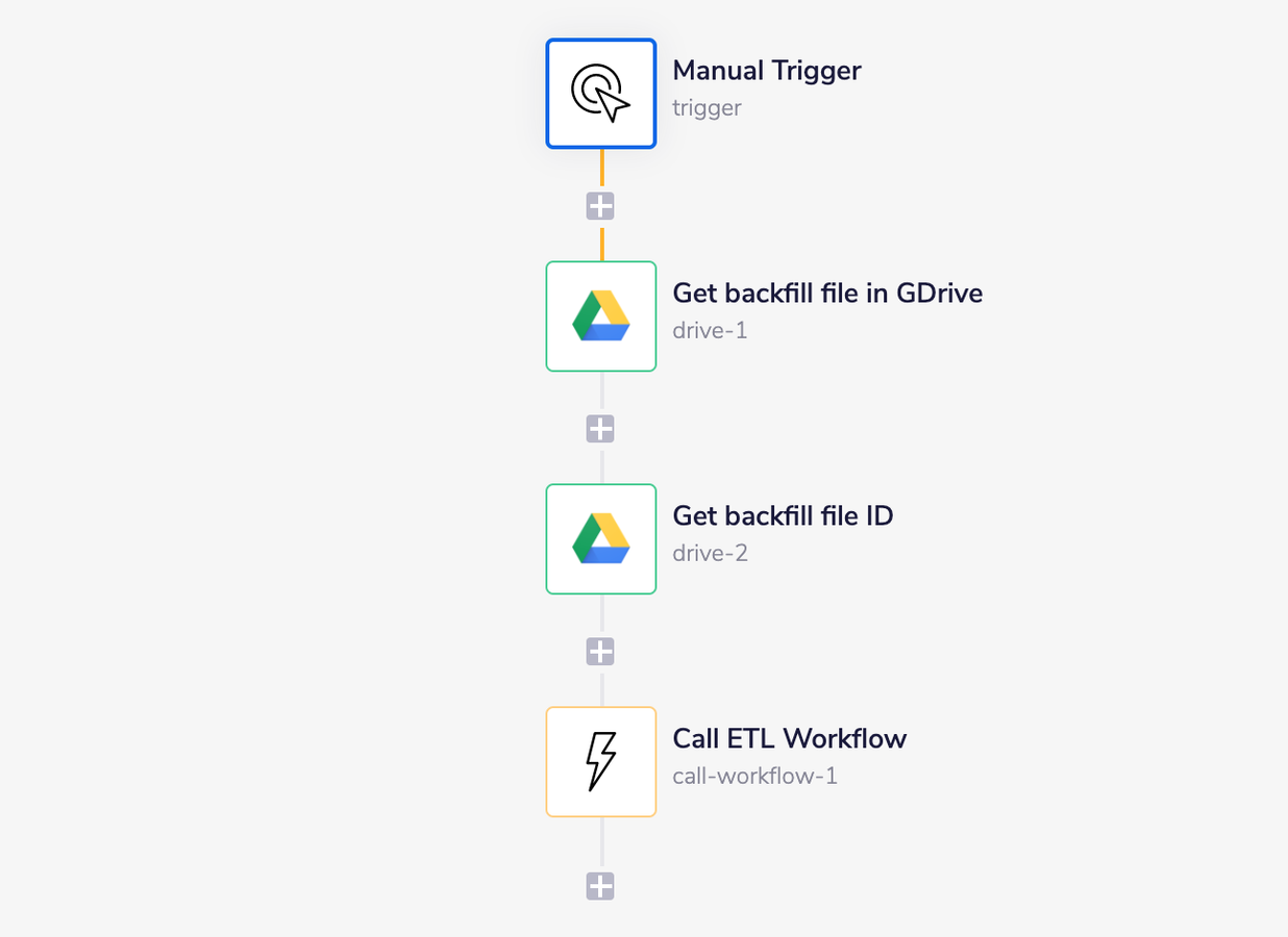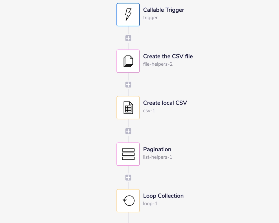 Before our upload process begins with a manual trigger, we first want to upload the CSV file of data into our cloud-based storage tool (we use Google Drive). Once the file is ready, we run the workflow to pull data from the file and the file ID, and trigger the third stage of our list upload workflow using a call workflow helper. Easy as that!