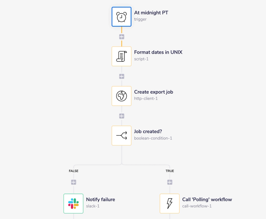 - Creating a scheduled export job - We run this workflow every night to request a new export job from our live chat tool (like Intercom or Drift). If a request is successful, we proceed to the next step. If a request isn’t successful, we send an alert to stakeholders in our internal chat tool (like Slack or Microsoft Teams).
