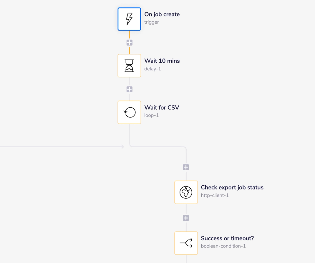 Wait for CSV - After 10 minutes, our workflow enters a loop that waits until the job is complete. For each run of our loop, we first check the status of the export job. Then, we confirm if the job is complete or still needs time to run.