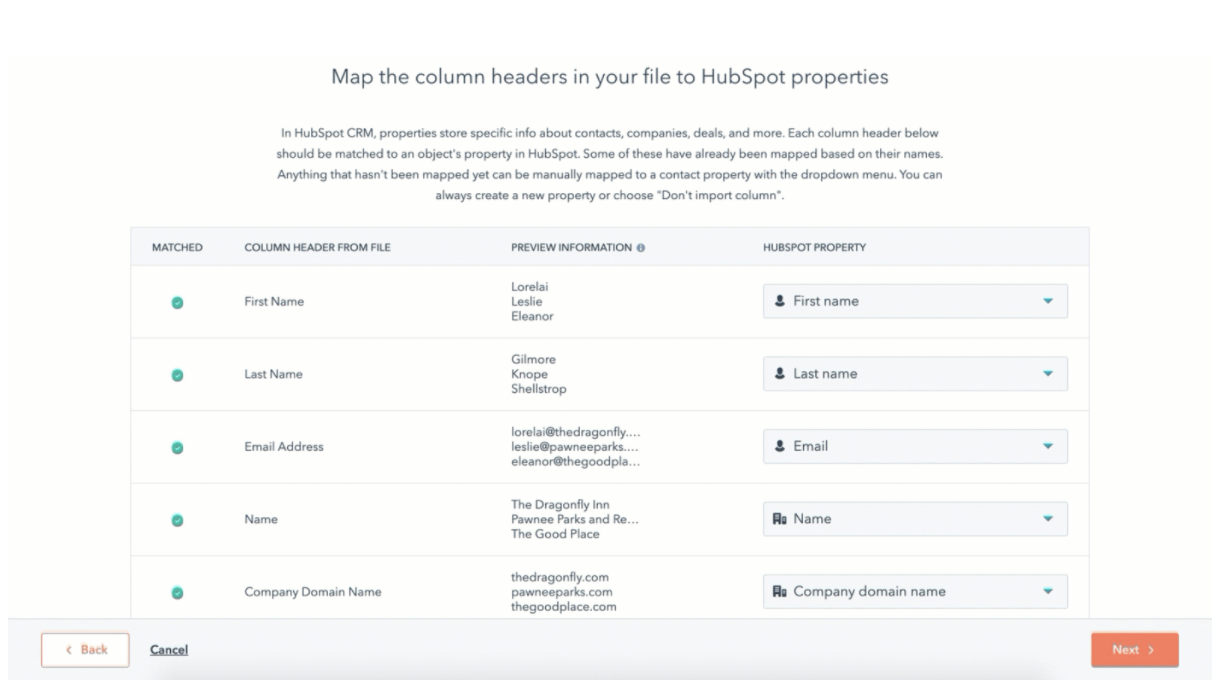 To start importing multiple objects, upload your file of choice (in this case, our spreadsheet) into HubSpot. Make sure your spreadsheet file is not only formatted correctly but also mapped correctly. HubSpot automatically matches the column headers in your file with your designated properties. If your columns don’t match or are left blank, your file will fail to import. You can change incorrectly matched columns by selecting the correct property in the dropdown menu beside it.