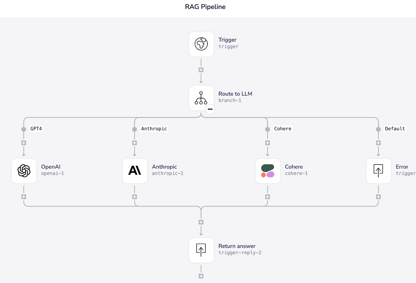 Tray’s low code workflow builder means you can get to a point where your knowledge agent is delivering value quickly without having to extend your engineering teams or bring in AI experts. Below is a workflow built on Tray that is routing a query to different LLMs depending on a particular parameter in the request. This can be set up in minutes and shows why Tray is perfect for swapping out different vendors and avoiding being locked in.