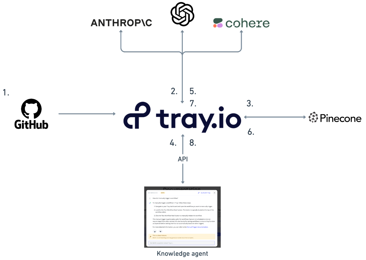 - First, the team set up a pipeline to ingest all of our docs content. This is set up as a large initial run. Then, there is a subscription in place that captures new content when it is made public. Tray processes the data and chunks it up so that it’s ready for the next step.
