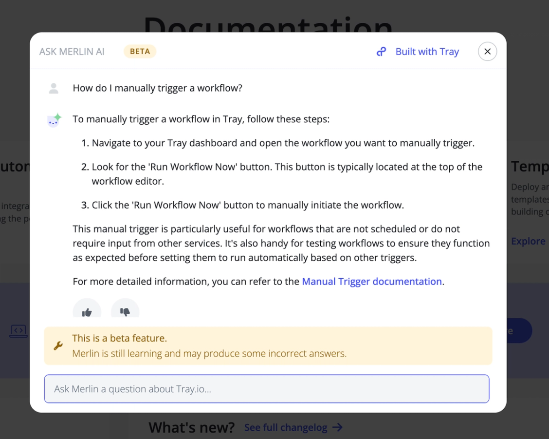 The agent is now in place and is making it super easy to navigate our documentation, but we’re not stopping there. As I covered earlier in the blog post, Tray makes it very easy to not only ingest data from pretty much any system but to also integrate the AI processes you build on Tray within your existing business processes. Here are just a few of the things we’re working on: